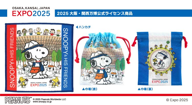PEANUTSと大阪・関西万博のコラボアイテムに、巾着とハンカチが新登場!!
