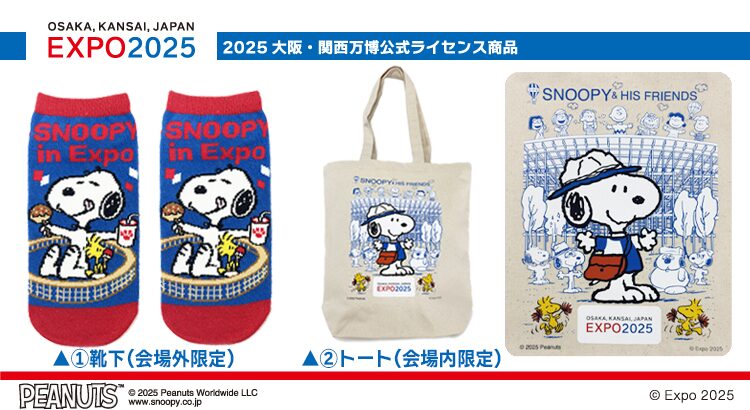 SNOOPYと大阪・関西万博のコラボシリーズに、会場外販売の靴下と会場内販売のトートバッグが新登場!!