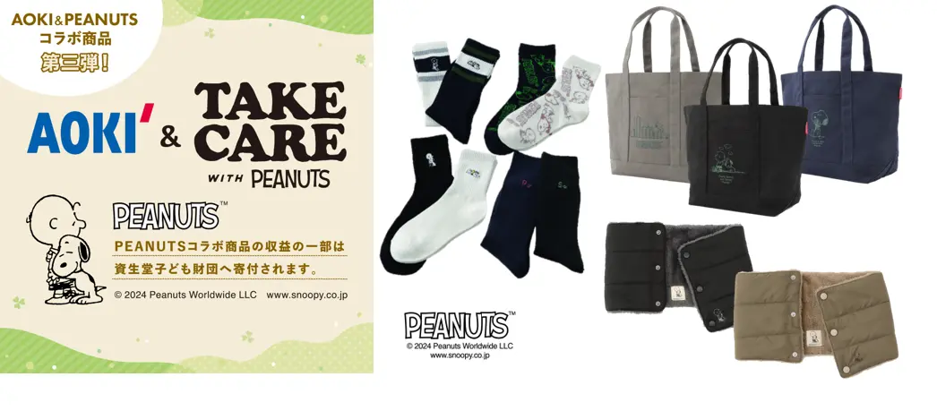 スヌーピーのアオキコラボ商品は、店頭やAOKIオンラインショップで購入可能◎