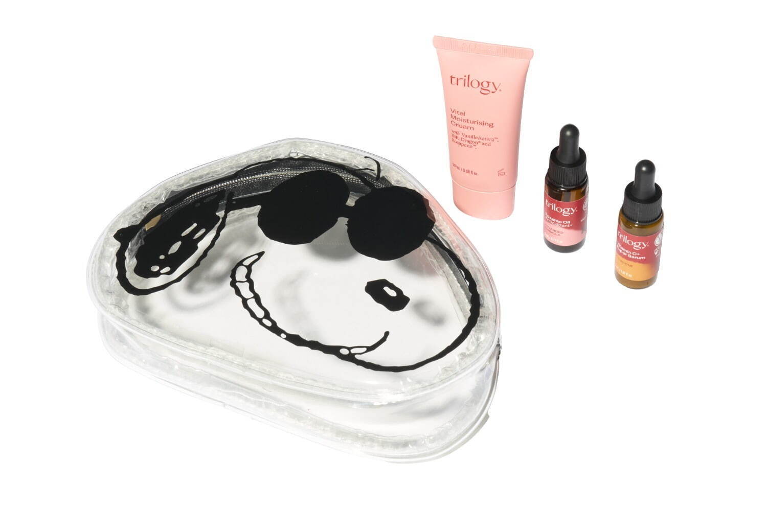 トリロジー(trilogy)の、人気オイル・美容液・クリームのミニ3点がジョー・クール型のポーチに入った限定スキンケアキット✴︎°.