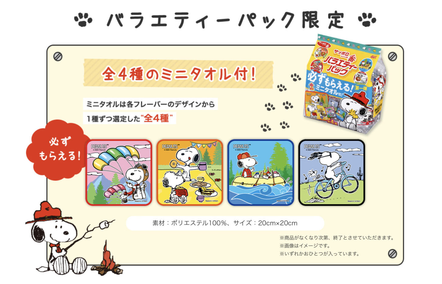 さらにバラエティパック限定で、全4種中1種類のミニタオルがもれなく付いてくる!!