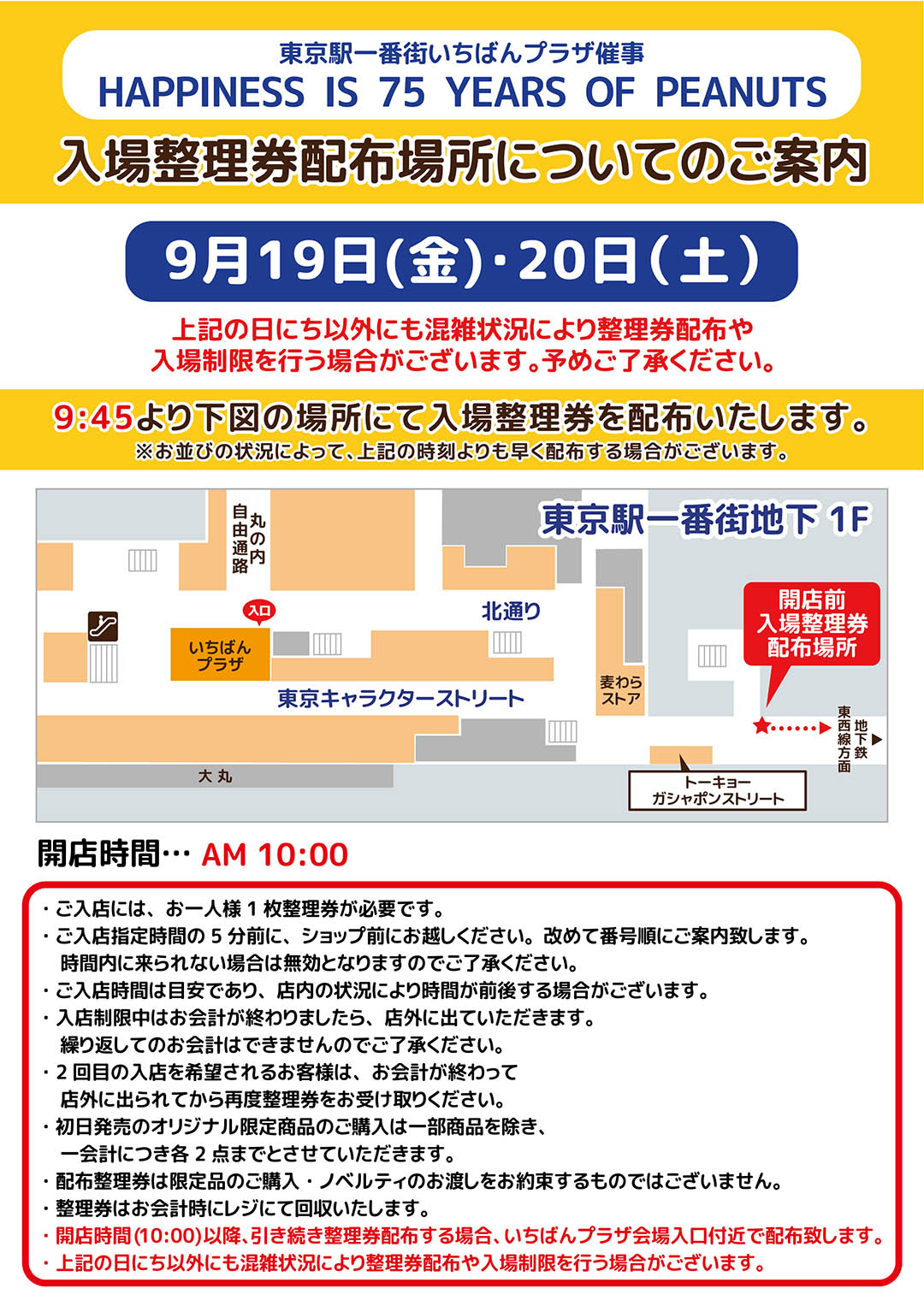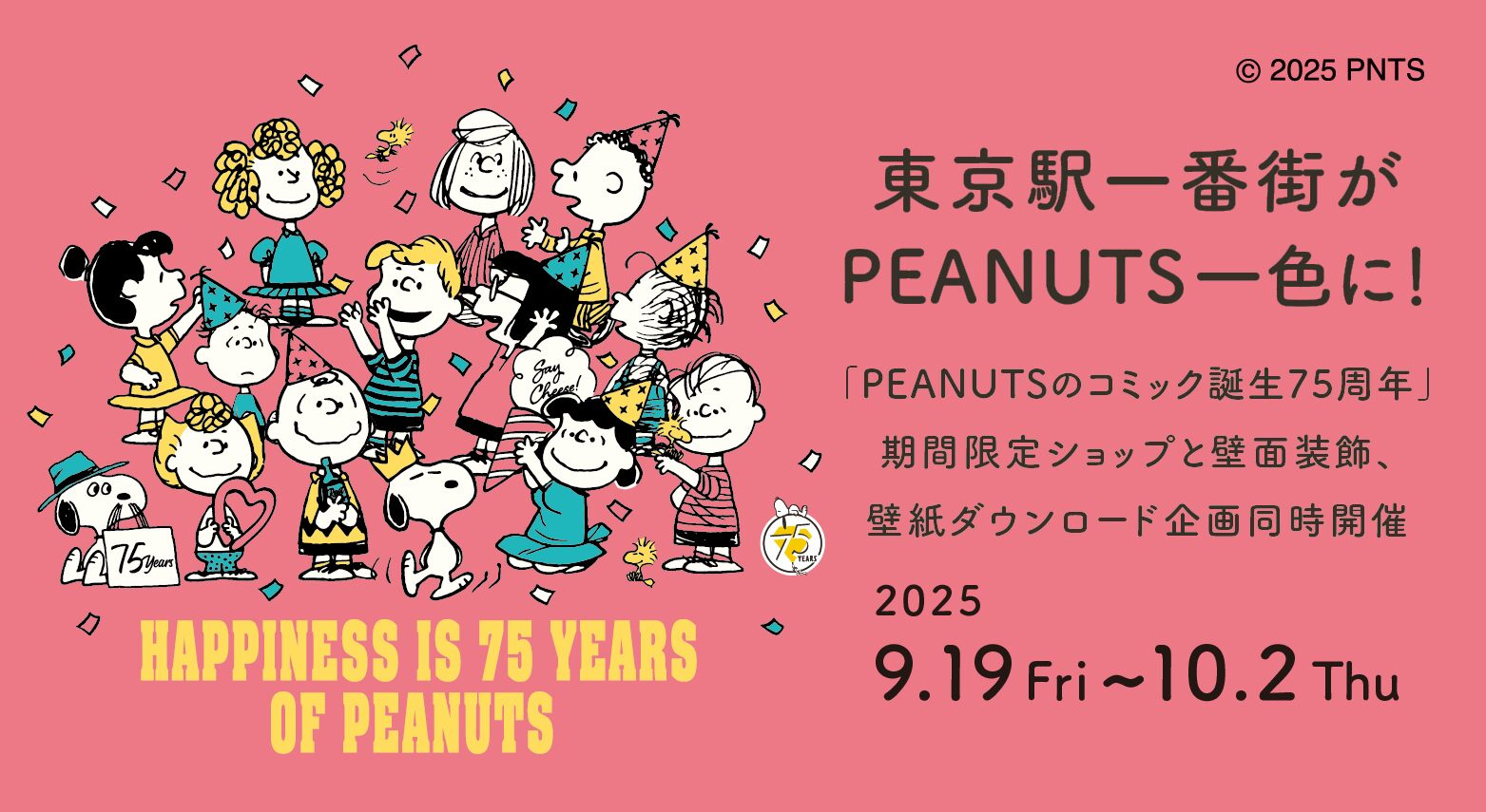 今年もイベント期間中、東京駅地下の「東京駅一番街」にPEANUTSコミック75周年をお祝いする装飾が登場するよ〜✴︎°.